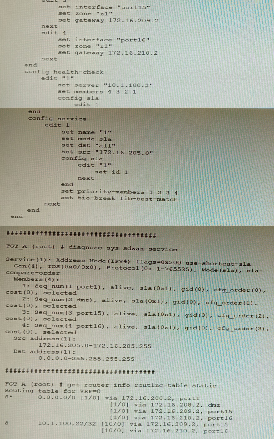 According to the exhibit, if an internal user pings 10.1.100.2 and 10.1.100.22 from subnet 172.16.205.0/24, which outgoing interfaces will be used?