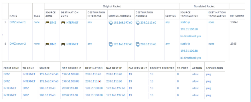 A new application server 192.168.197.40 has been deployed in the DMZ. There are no public IP addresses available resulting in the server sharing MAT IP 198 51 100 B8 with another OMZ serve that uses IP address 192 168 19? 60 Firewall security and NAT rules have been configured The application team has confirmed mat the new server is able to establish a secure connection to an external database with IP address 203.0.113.40. The database team reports that they are unable to establish a secure connection to 196 51 100 88 from 203.0.113.40 However it confirm a successful prig test to 198 51 100 88 Referring to the MAT configuration and traffic logs provided how can the firewall engineer resolve the situation and ensure inbound and outbound connections work concurrently for both DMZ servers?