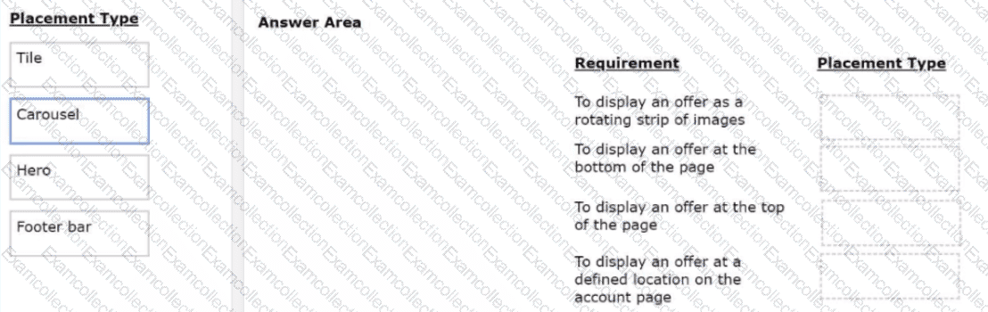 U+ Bank has decided to use the Pega Customer Decision Hub, M to recommend more relevant banner ads to its customers when they visit the personal portal. Select each placement type on the left and drag it to the correct requirement on the right.