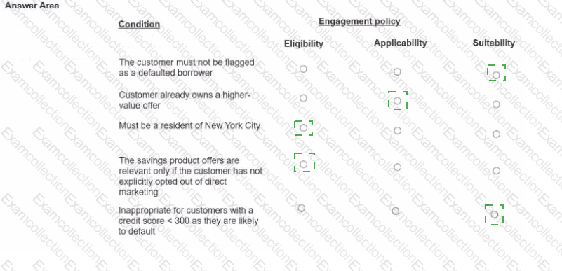 U+ Bank, a retail bank, has recently implemented a project in which credit card offers are presented to qualified customers when they log in to the web self-service portal The Dank added engagement policy conditions to show the offers based on the bank's requirements.