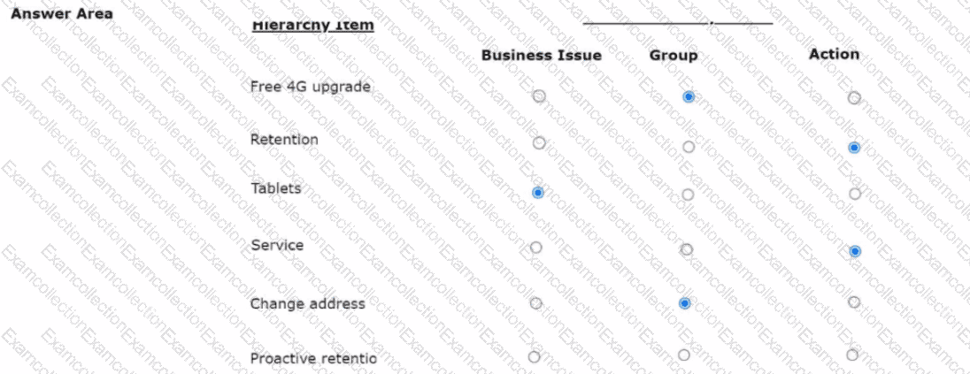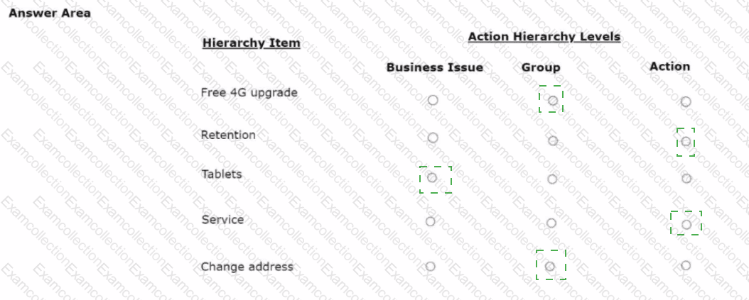 As a decisioning architect, you are setting up the action hierarchy for MyCo. Select the correct action hierarchy level for each of the hierarchy items identified.