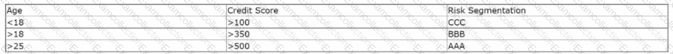 U+ Bank wants to offer credit cards only to customers with a low-risk profile. The customers are divided into various risk segments from AAA to CCC. The risk segmentation rules that the business provides use the Age and the customer Credit Score based on the following table. The bank uses a scorecard model to determine the customer Credit Score.