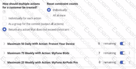 In the following figure, a volume constraint uses the Return any action that does not exceed constraint mode with the three following action type constraints that have remaining limits: