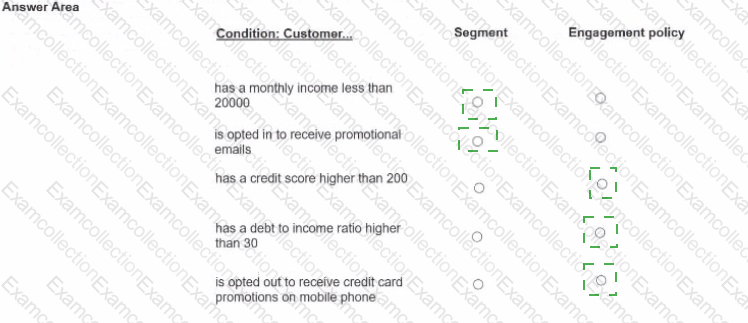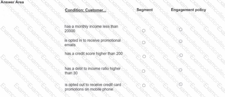 For each condition below, select which two conditions should be defined in Segment and which three conditions should be defined in Engagement policy as best practice