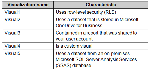 Your Power BI infrastructure contains the visualizations configured as shown in the following table.