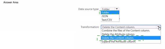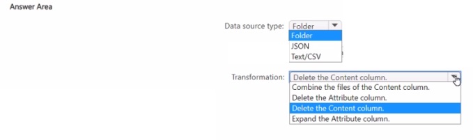 Which type of data source should you use. and which transformation should you perform? To answer, select the appropriate options in the answer area.