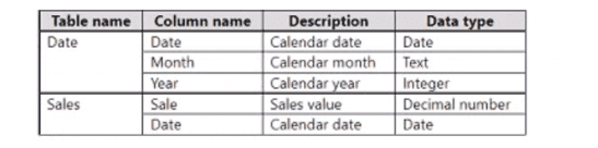 You have a Rawer Bl report That imports a dace table and a sales table from an Azure SQL database data source. The sales table has the following date foreign keys: