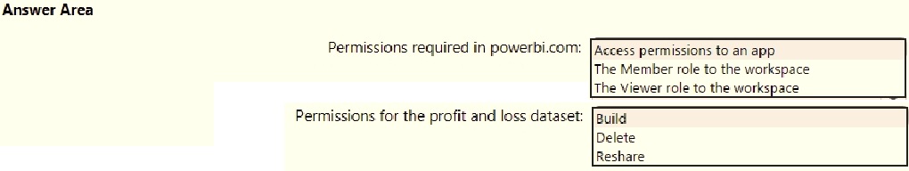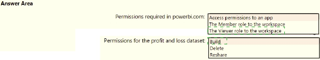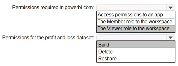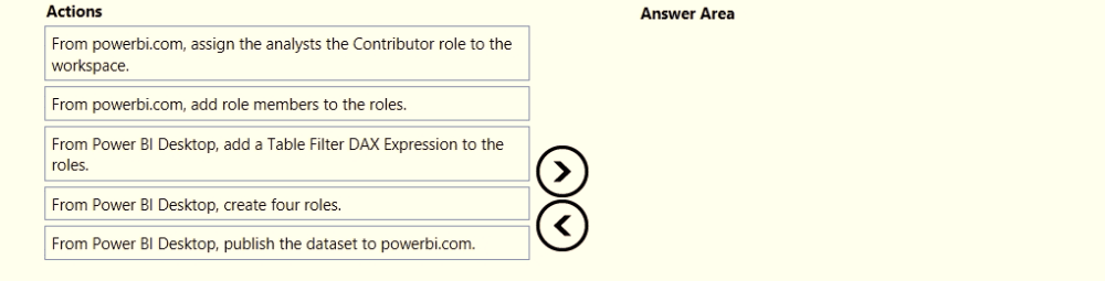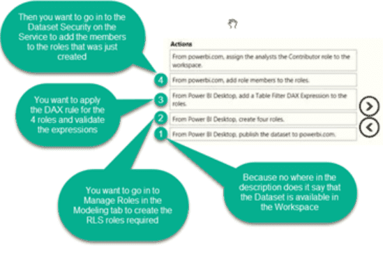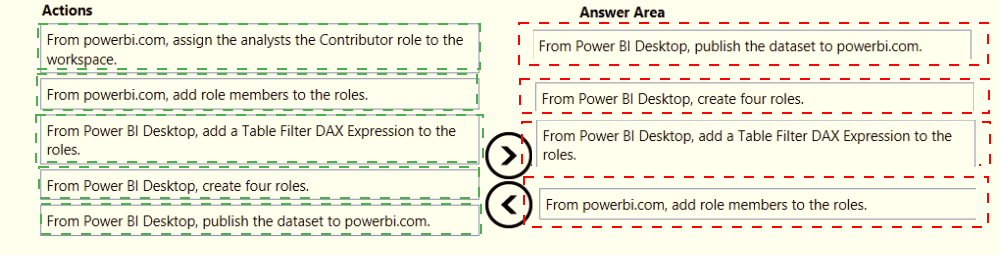Once the profit and loss dataset is created, which four actions should you perform in sequence to ensure that the business unit analysts see the appropriate profit and loss data? To answer, move the appropriate actions from the list of actions to the answer area and arrange them in the correct order.