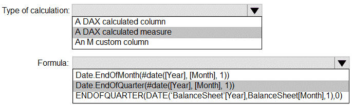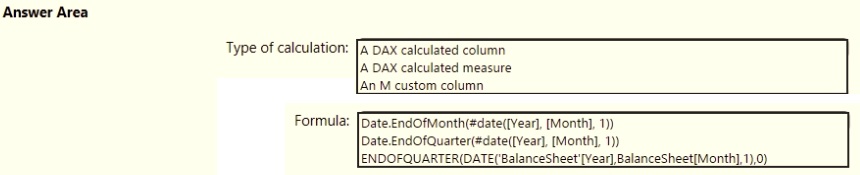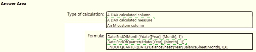 You need to calculate the last day of the month in the balance sheet data to ensure that you can relate the balance sheet data to the Date table. Which type of calculation and which formula should you use? To answer, select the appropriate options in the answer area. NOTE: Each correct selection is worth one point.