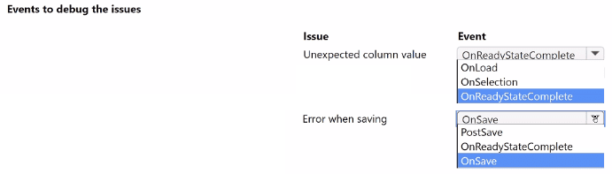 Which events should you debug? To answer, select the appropriate options in the answer area.