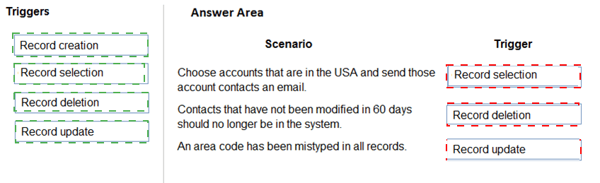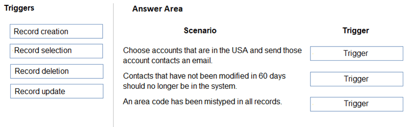 Which triggers should you use? To answer, drag the appropriate triggers to the correct scenarios. Each trigger may be used once, more than once, or not at all. You may need to drag the split bar between panes or scroll to view content.