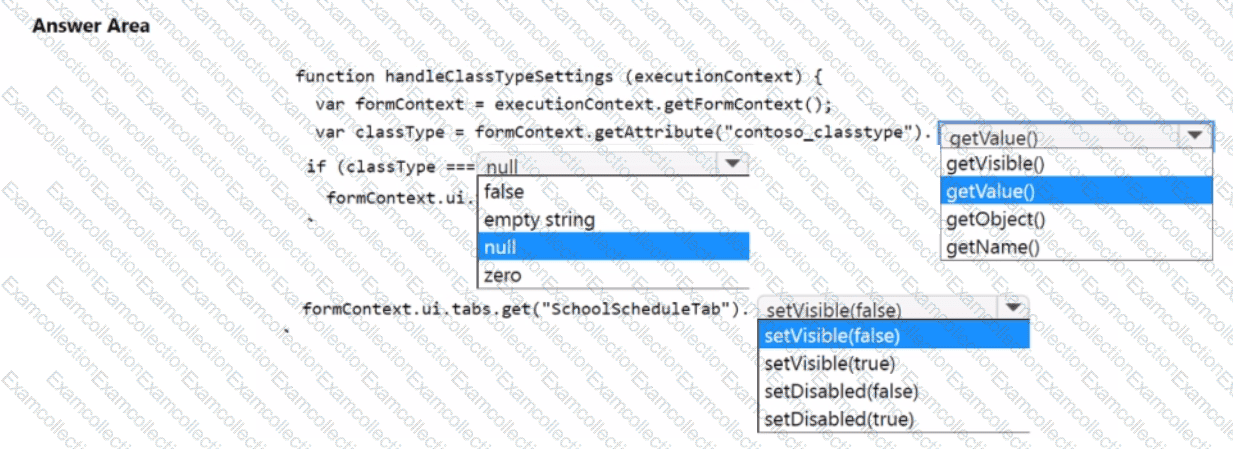 You need to implement client-side logic that uses the Microsoft Dataverse web API to evaluate the class type associated with a class record. The code must hide the School Schedule tab if no value is entered for Class Type.