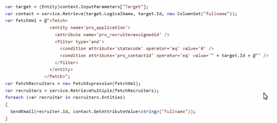You develop the following code for the plug-in that sends email notifications to recruiters.