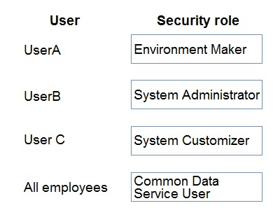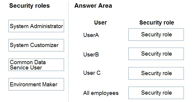 Which security roles should you use? To answer, drag the appropriate security roles to the correct users. Each security role may be used once, more than once, or not at all. You may need to drag the split bar between panes or scroll to view content.