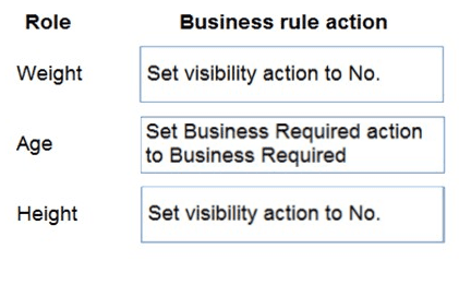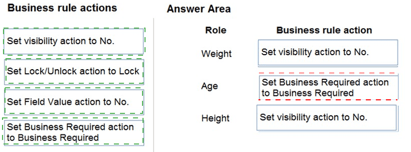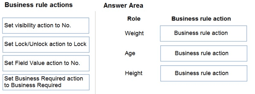 Which business rule actions should you use? To answer, drag the appropriate business rule actions to the correct fields. Each business rule action may be used once, more than once, or not at all. You may need to drag the split bar between panes or scroll to view content.