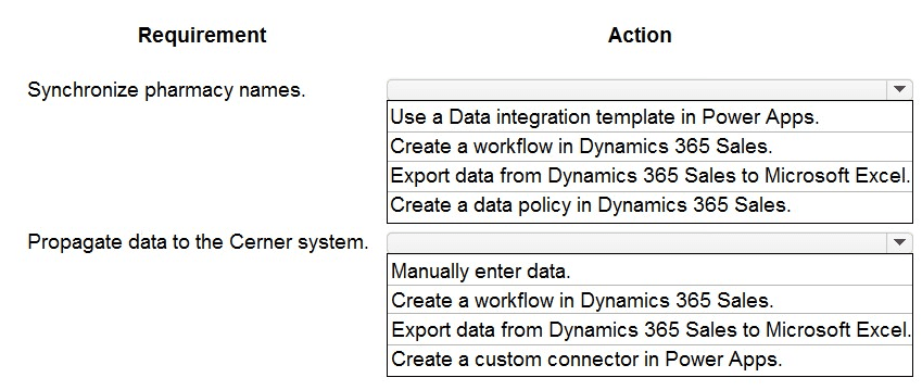 You need to synchronize pharmacy names and ensure that Dynamics 365 Sales data propagates correctly to the Cerner system.
