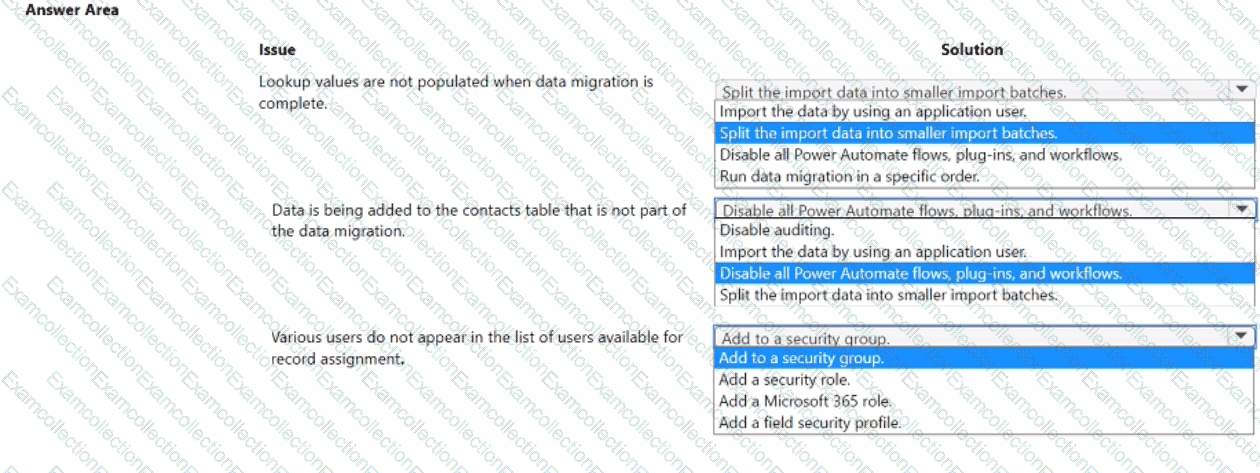You are implementing a Microsoft Power Platform solution for a customer to include data migration from multiple legacy systems. The data includes lead and contact data. The environment includes an assigned security group.