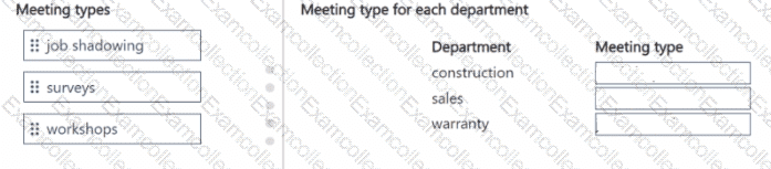 To answer, move the appropriate meeting types to the correct departments. You may use each meeting type once, more than once, or not at all. You may need to move the split bar between panes or scroll to view content.