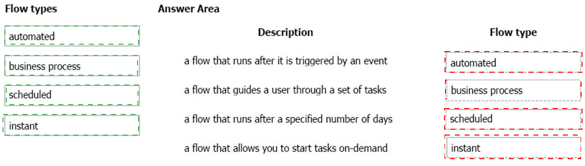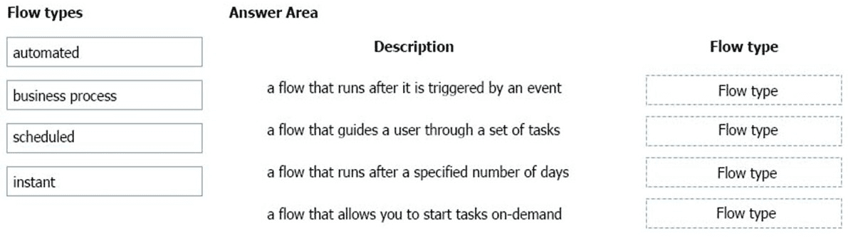 Match each flow type to its function. To answer, drag the appropriate flow type from the column on the left to its description on the right. Each option may be used once, more than once, or not at all.