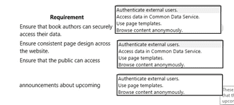 The company wants to implement a Power Apps portal solution to make announcements about upcoming books to the general public.