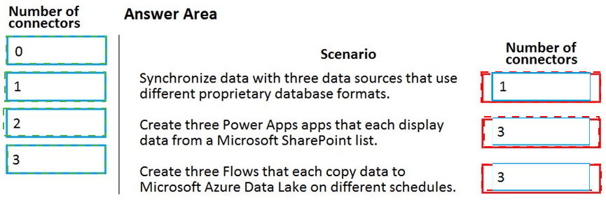 A company plans to create a canvas app that connects to three databases with different proprietary database formats. What is the minimum number of connectors required?