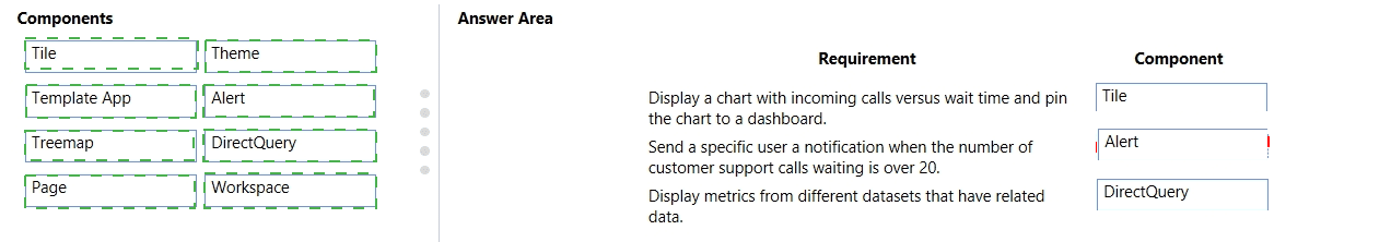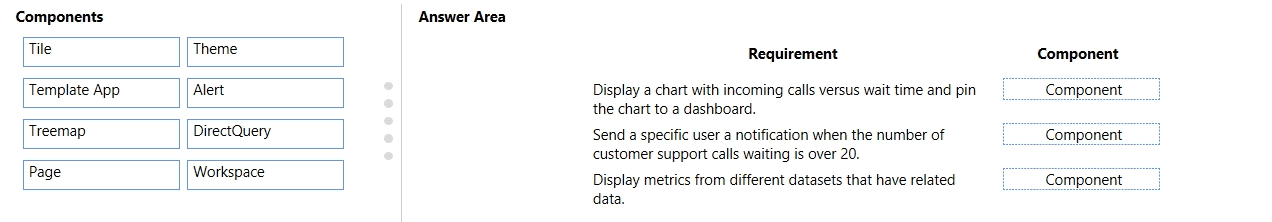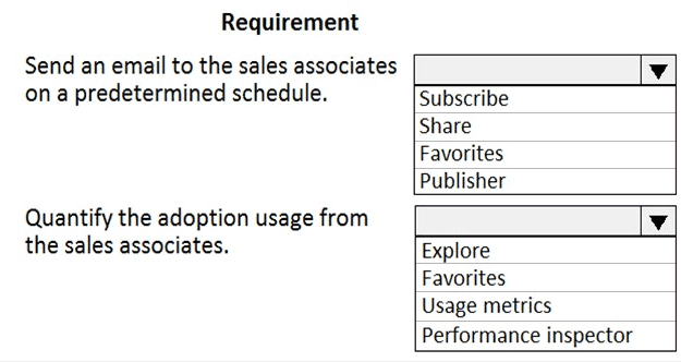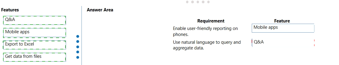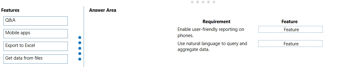 Match each Power Bl feature to its requirement. To answer, drag the appropriate features from the column on the left to its requirement on the right. Each option may be used once, more than once, or not at all.