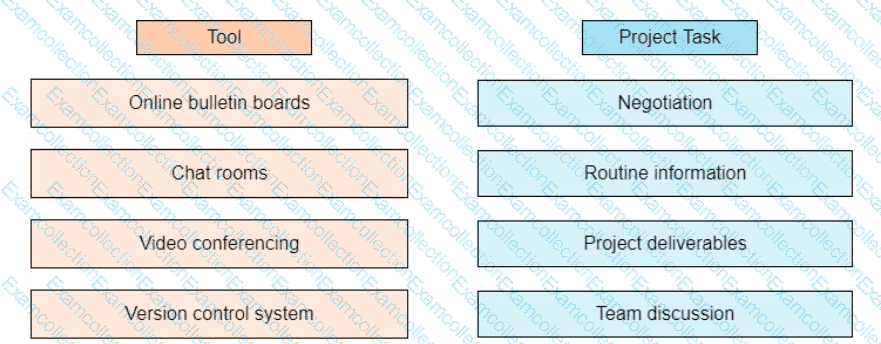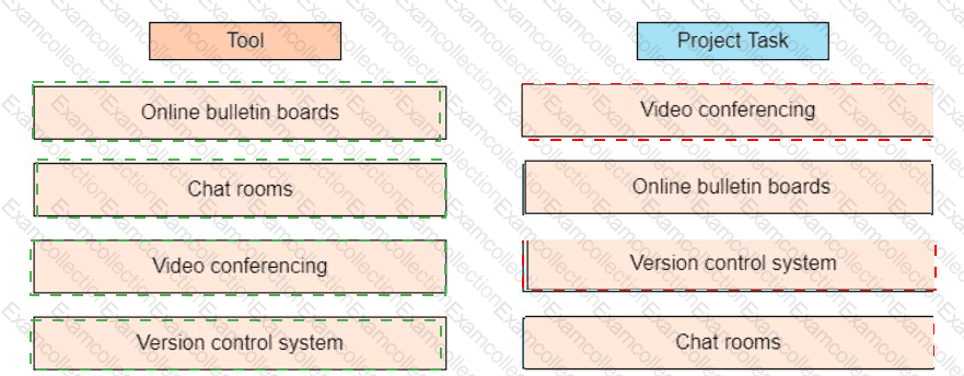 An agile team is geographically separated across multiple continents, and the project manager of identifying the tools to manage the communication among the virtual teams Drag the appropriate tool on the left to each project task on the right