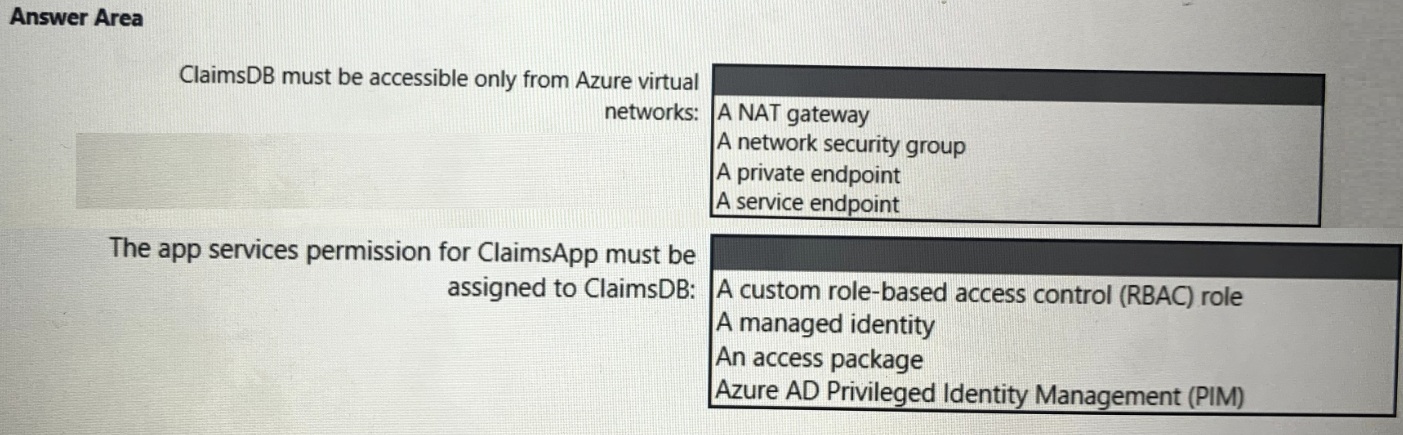 You need to recommend a solution to meet the requirements for connections to ClaimsDB.