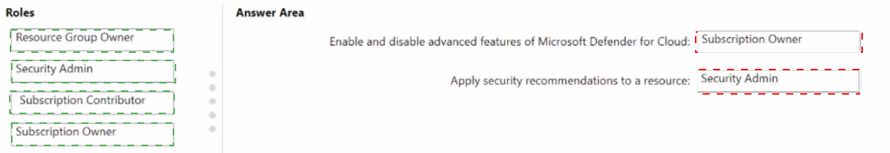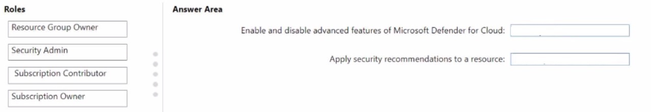 Which Microsoft Defender for Cloud role should you use for each requirement? To answer, drag the appropriate roles to the correct requirements. Each role may be used once, mote than once, or not at all. You may need to drag the split bar between panes or scroll to view content.