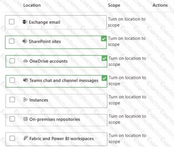 Solution: You create a data loss prevention (DLP) policy that has Exchange email, SharePoint sites, OneDrive accounts, and Teams chat and channel messages selected.