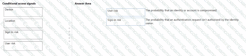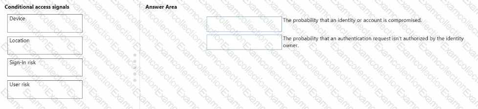 To answer, drag the appropriate Conditional Access signal type from the column on the left to its definition on the right. Each signal type may be used once, more than once, or not at all.