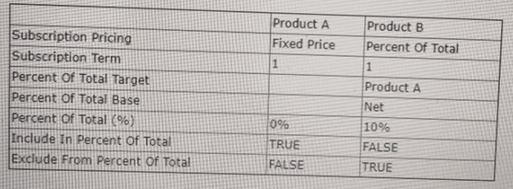 Universal Containers offers a maintenance subscription, Product B, that is based on the price of a separate platform license subscription, Product A. The current configuration is: